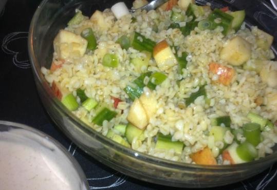 Bulgur med selleri og æble. Kog bulgur efter anvisning på posen. Køl af og bland med selleri, agurk og æble i fine tern. Tilsæt revet løg citronsaft, olie og salt og peber.