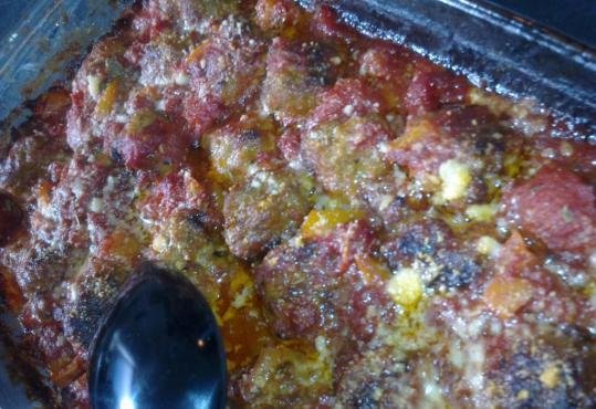 Små kødboller i tomat: Bland ingredienser til tomatsovsen, hæld i et ildfast fad og stil i ovnen ved 200 grader i ca. 40 minutter. Imens tilberedes kødbollerne, rør farsen med de nævnte krydderier og form små boller med en teske. Steg i smør-olie på pande i ca. 15 minutter. Kom kødbollerne i tomatsovsen,drys over med friskrevet parmesan (kan udelades) og lad stå i ovnen 15 minutter ekstra.