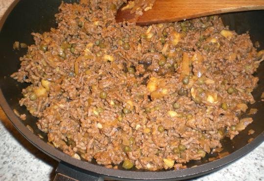 Når kødet er gennemstegt tilsættes indmaden fra squashene og ketchup. (Vælg en god krydret slags)