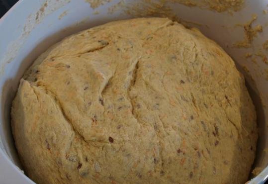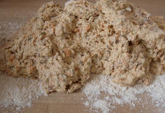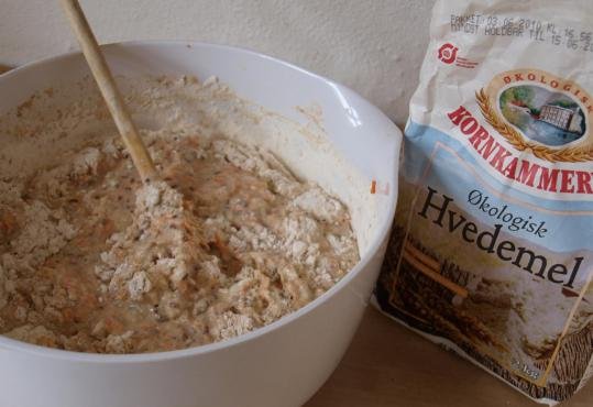 To store brød med sunde sager. Der er gulerødder, yoghurt og en del olie, så det holder sig frisk længere. Brødene er resultatet af hvad vi havde af ingredienser. Af dømme efter hvad “spiserne” mener, blev det nogle ret gode brød – og jeg er helt enig