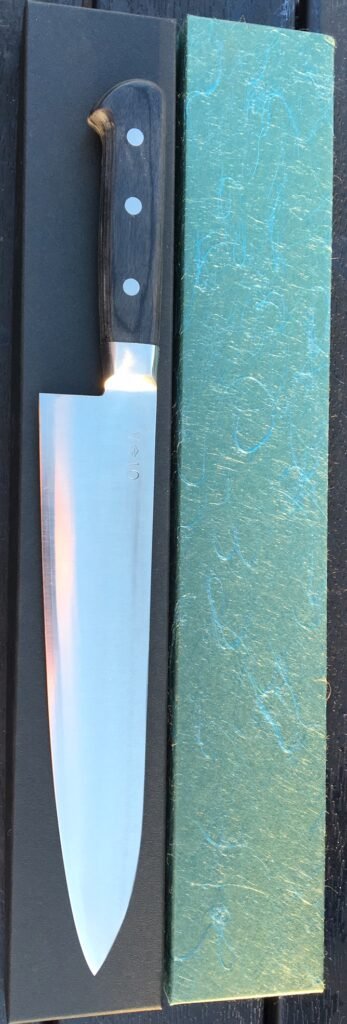 Håndlavet Japansk chef kniv i VG-10 stål, med 24 cm langt blad. Kniven er en prototype vi har fået hjem fra vores Japanske smed, som ikke kommer i vores løbende sortiment.